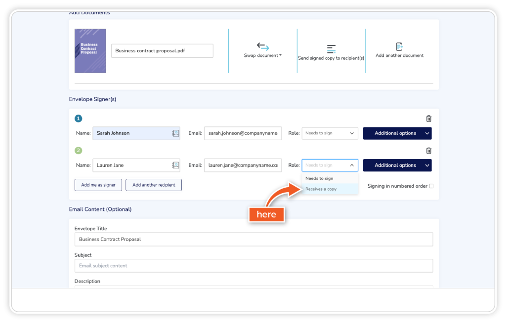 Go to Envelope Signers and Add Recipient. You can add more than one signer, but select only one person to receive a copy of the document.