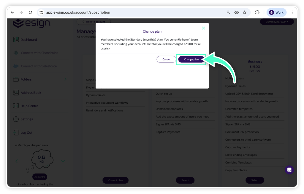 If your current plan has expired, or you would like to upgrade your account to a new plan to start sending more envelopes, please follow the steps below.