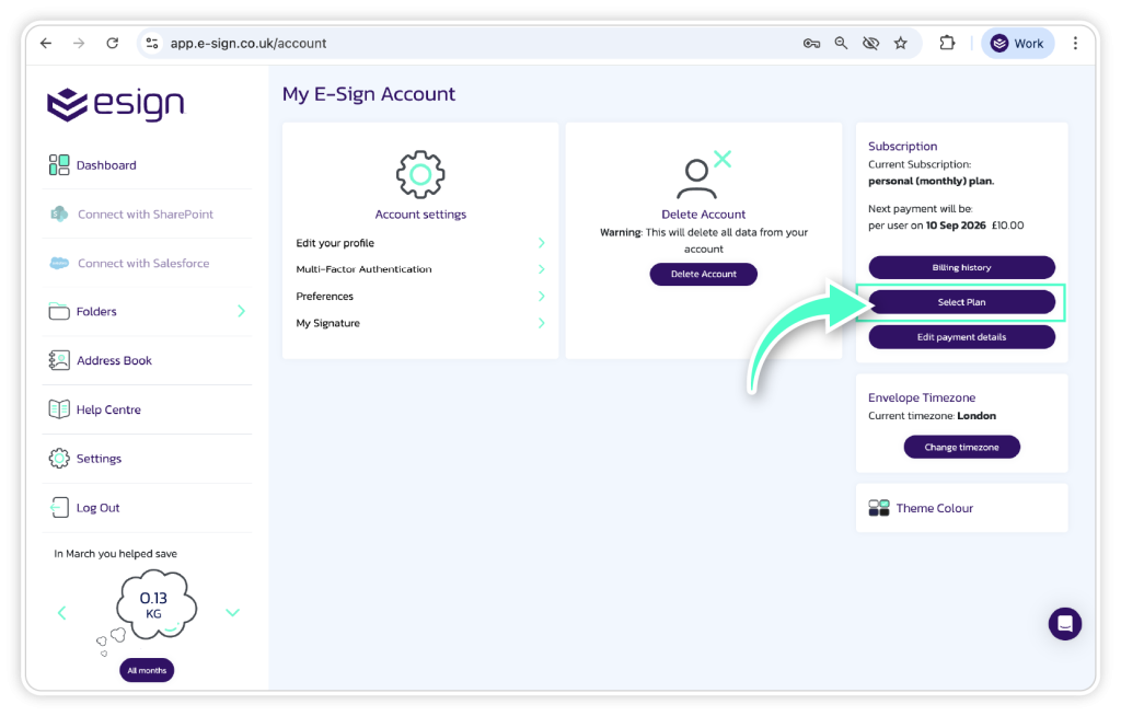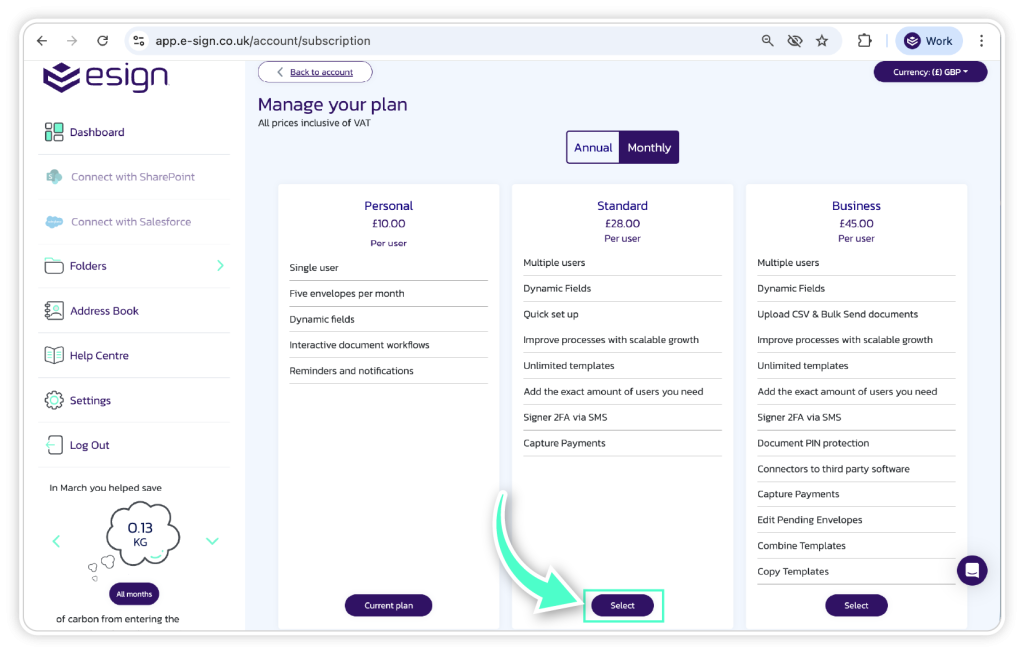 In the subscription section you will be able to see the existing plan you are on and when it is set to expire. To upgrade, click ‘Select Plan’.