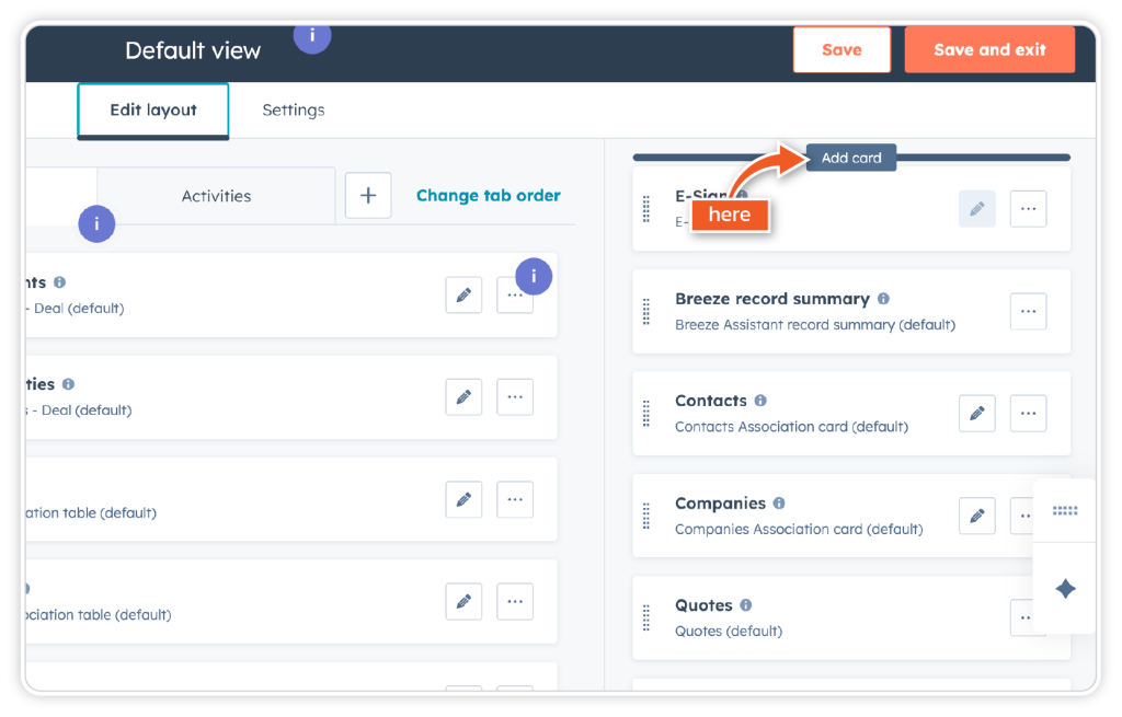 Find eSign and add it as a card. Then close the window. Click ‘Save and exit’.